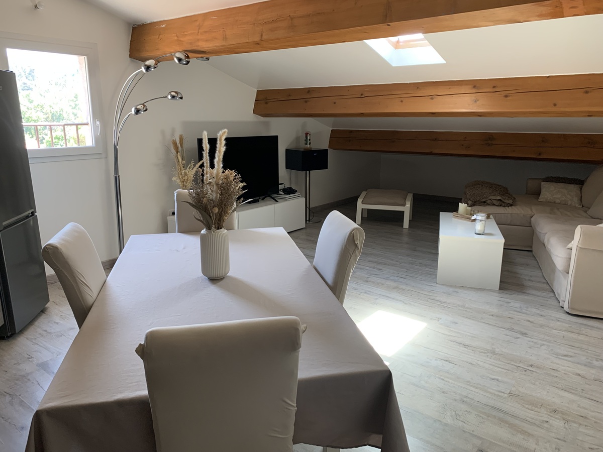 Rocbaron - En 2ème et dernier étage d'immeuble, bel appartement de 92.10m² (dont 38m² -1m80). Il se compose d'une pièce à vivre avec cuisine ouverte entièrement équipée, d'une pièce attenante, d'une chambre et d'une salle d'eau wc.