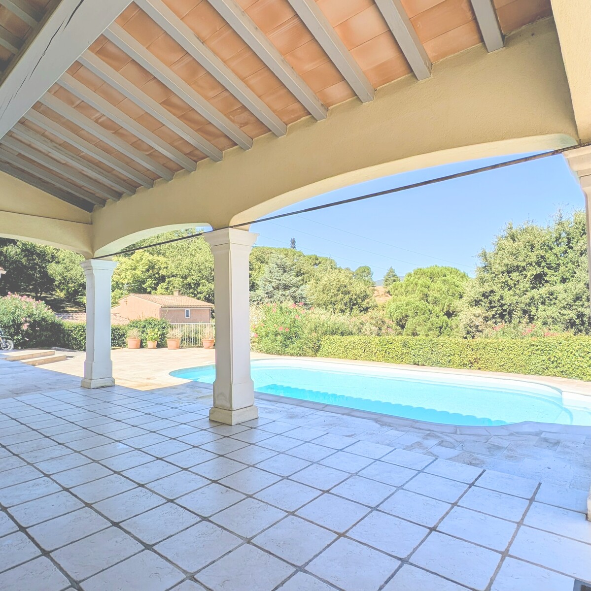 Édifiée sur un terrain clos de 2 000 m², elle offre une superbe vue dégagée sur la campagne des Maures. Le plain-pied de 123 m² s’ouvre sur une de pièce de vie spacieuse et lumineuse donnant sur la terrasse et la piscine. Dans le prolongement on trouve une cuisine ouverte puis une véranda de 30m². Une mezzanine de 20 m² surplombe le séjour et peut accueillir un bureau, un espace détente ou une chambre d’appoint. Deux chambres avec douches et un WC complètent la partie habitable.