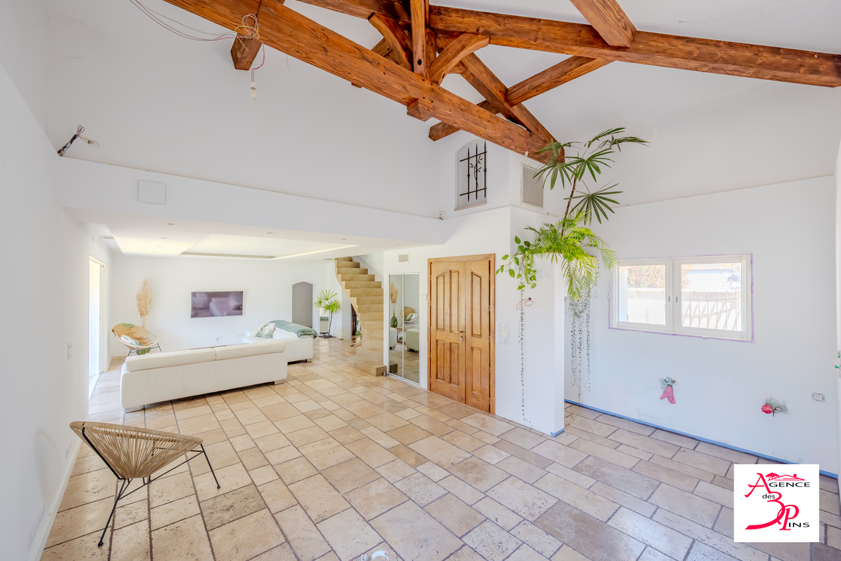 L’entrée ouvre sur une vaste pièce de vie aux volumes généreux où s’articulent l’espace cuisine avec ferme apparente et le salon.